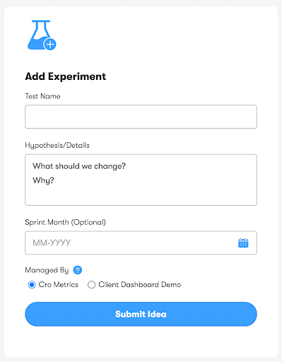 Make it ridiculously easy for anyone to submit test ideas. For example, in Iris, we put an idea submission form front and center.