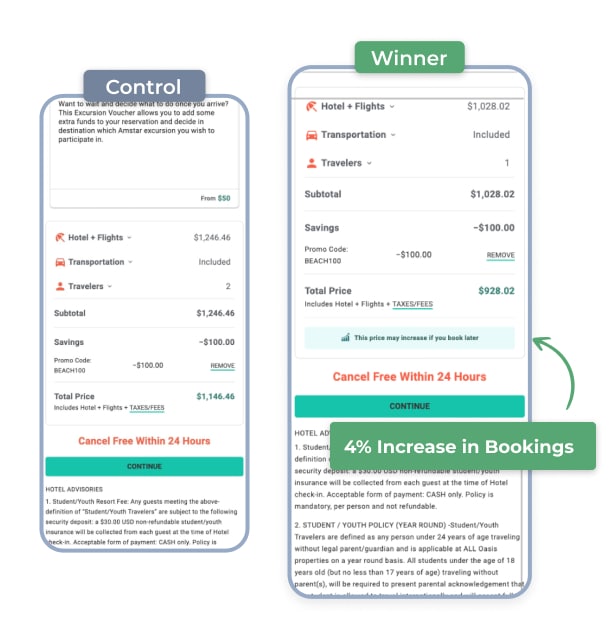We added a simple callout next to the vacation price on the checkout details step of one of our OTA (Online Travel Agency) clients: “This price may increase if you book later.”