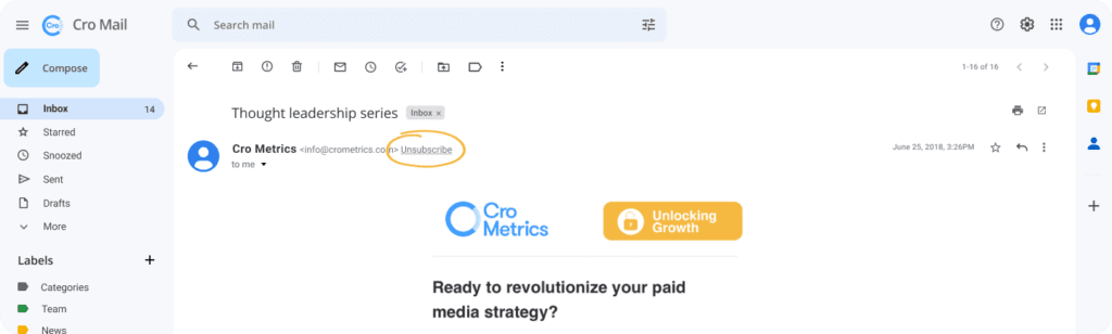 Include a list-unsubscribe header for one-click unsubscribes. Many ESPs, including Klaviyo, are automating this process. Maintain a clearly visible unsubscribe option within the email body.