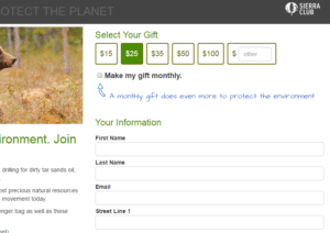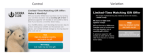 Two tests were aimed at increasing the number of Sierra Club donors who sign up to give recurring monthly donations at the time of their initial donation.
