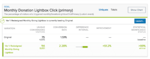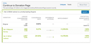 Results from this test were among the most surprising of the bunch. Amazingly, the first variation—the midpage survey—generated a 1,339 percent lift in visitors making a donation. The average amount was about $25. Still, the Cro Metrics team calculated that the test inspired 102 additional donation per month for a total of more than $2,500. The second variation was very successful as well, but those visitor did not convert to donate at high of a rate.. “Running multiple variations of a single broader hypothesis allows us to get more insights from each experiments,” notes Janczyn. “With this experiment, if we’d tested only the second variation, we would have identified it as a “win,” but we wouldn’t have found the better win that was the first variation. By testing both, we are able to see how they perform against each other as well as against the original.”