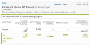 For SIERRA-17, the data revealed that having handwritten text and an arrow pointing toward the monthly giving checkbox had a significant positive impact—a 207 percent increase in monthly donation conversions!